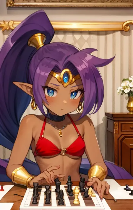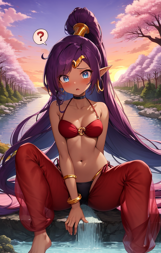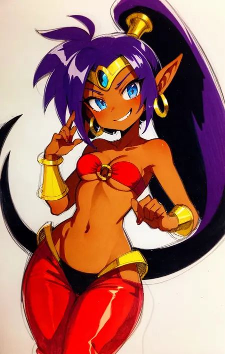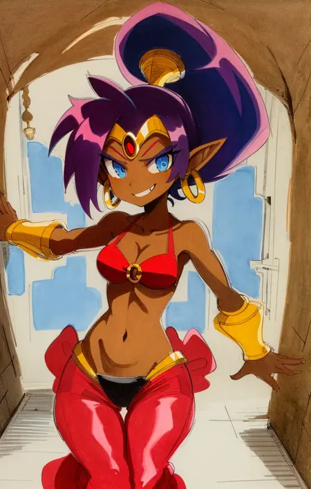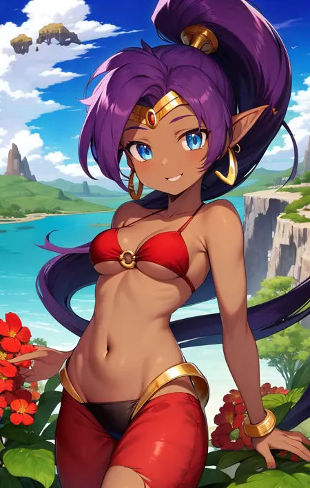“Shantae,透明红色束脚裤,O形环比基尼上衣,珠宝,金色镶边”——普通服装的示例提示。通常需要“深色皮肤”,因为几乎所有模型都会将肤色变白。