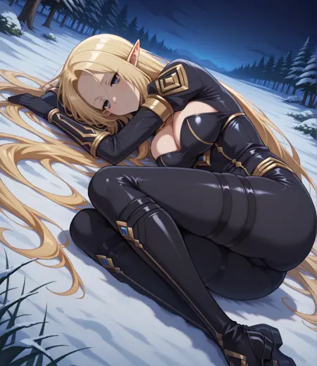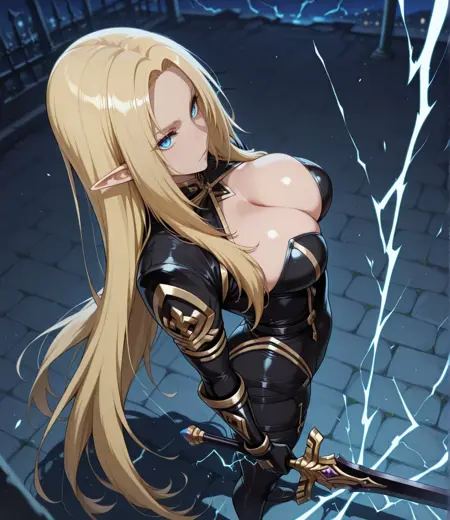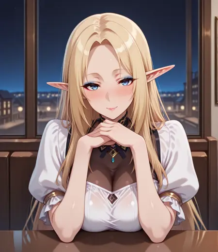 alpha, 1girl, blonde hair, blue eyes, parted bangs, sidelocks, elf, pointy ears, medium breasts, long hair, very long hair,