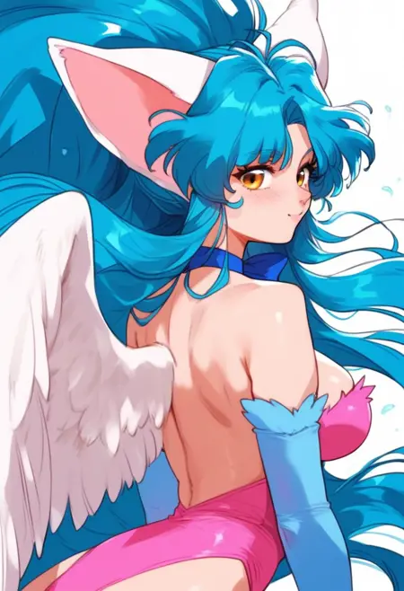 トリガー: limepony、長い髪、青髪の女性、動物の耳、肘まである手袋、ピンクのレオタード、翼