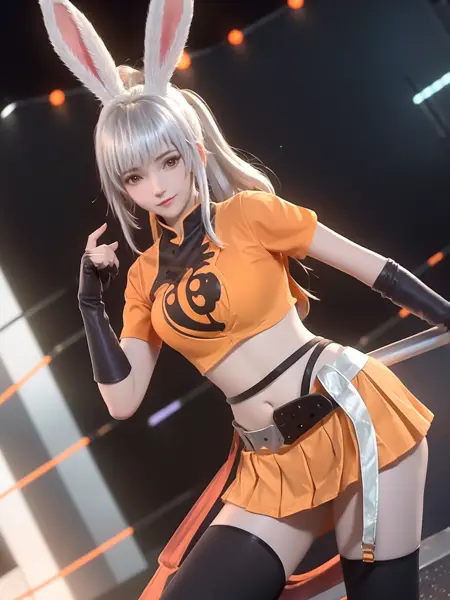 - WZRYgongsunliGF, 1girl, solo, rabbit ears, see-through sleeves, dress, long hair,looking at viewer, bangs, pleated skirt, blunt bangs, blonde hair, single glove, clothing cutout, puffy sleeves, cityscape, night, hand on hip, poolside,