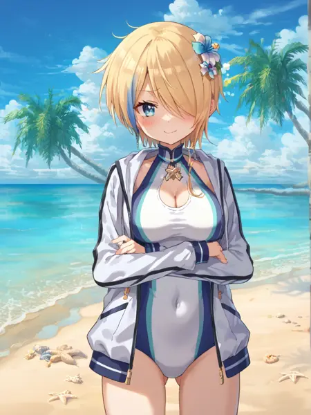 Prompt Sea: 1girl, solo, looking at viewer, smile, blush, short hair, blue eyes, blonde hair, long sleeves, hair ornament, hair flower, medium breasts, cleavage, hair over one eye, asymmetrical hair, white jacket, open jacket, white swimsuit, one-piece swimsuit, white one-piece swimsuit, covered navel, flower, blue flower, outdoors, sky, day, blue sky, cloudy sky, cloud, water, ocean, beach, sand, palm tree, tree, shell, starfish, seashell, hand on own hip, crossed arms, outfit2, ornaments, large breasts, outfit2