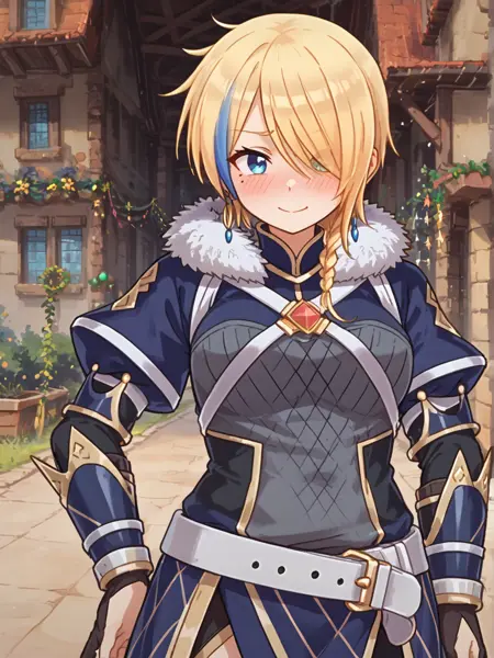 Prompt General: Claire-Liver020-wattpad, solo, 1girl, blonde hair, hair over one eye, multicolored hair, earrings, streaked hair, blue eyes, armor, short hair, mole, mole under eye, fur trim, braid, jewelry, streaked hair, earrings, belt, outfit1, breastplate, perfect eyes, perfect eye, ornaments