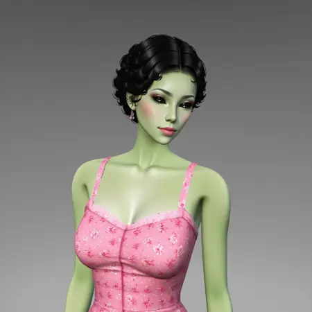 1woman,alien,colored skin,green skin,colored sclera,black sclera,black eyes,short hair,black hair,makeup,pink lips,pink dress,floral print dress