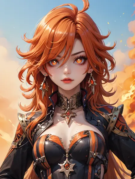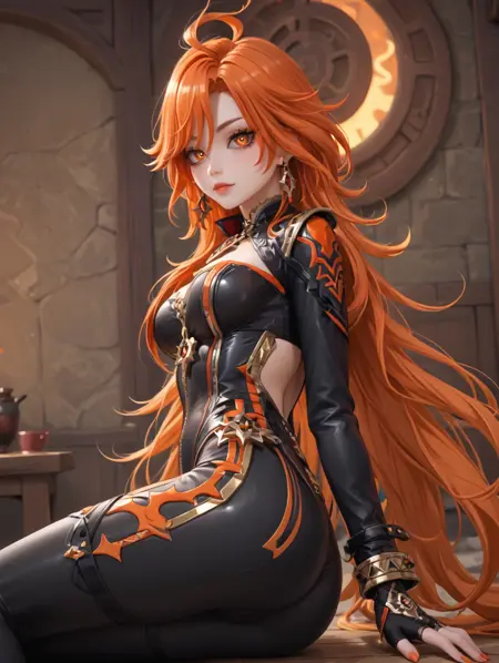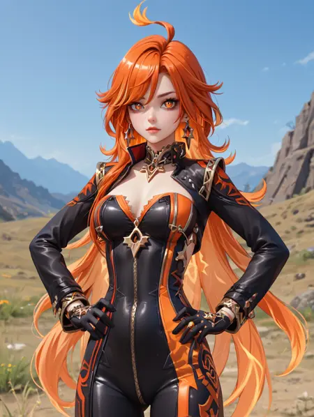 关键词:1girl, mavuika (genshin inpact), (官方游戏角色), 曲线丰满的大腿,异常长的头发,渐变火焰发型,符号眼睛,短款长袖夹克,黑色紧身连体衣