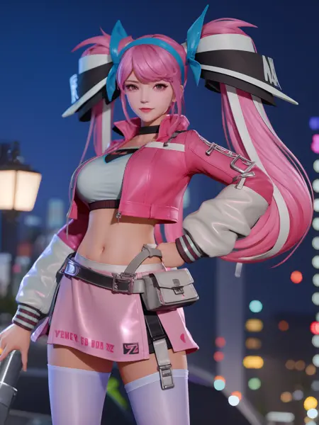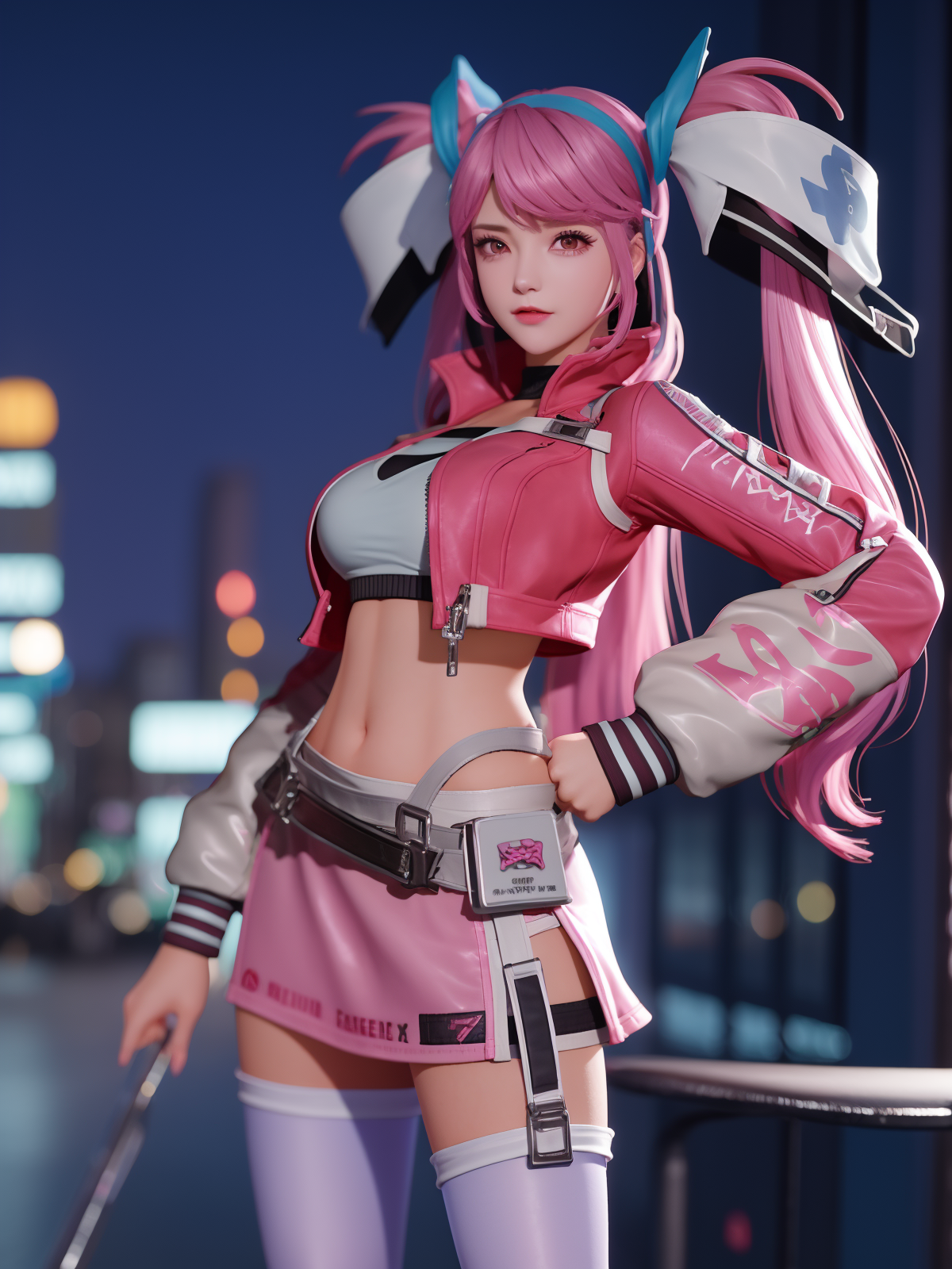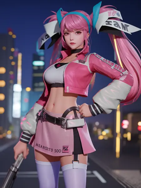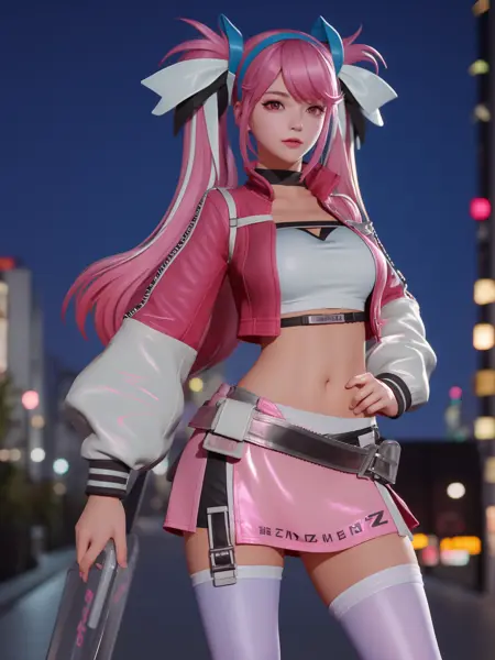 - WZRYsunshangxiangPHZG, 1girl, solo, pink hair, thighhighs, long hair, twintails, skirt, navel, midriff, breasts, pink eyes, hand on hip, cropped jacket, crop top, long sleeves, standing, belt, bangs, hairband, choker, mature female, cityscape, night, looking at viewer,