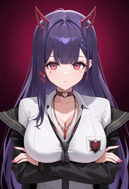 numi2, 1girl, 红眼睛, 角, 饰品, 紫色头发, 长发, 发饰, 穿孔, 刘海, 心形领饰, 白色衬衫, 暴露胸部, 大乳房, 领带, 黑色夹克, 蓝色裙子, 百褶裙, 黑色过膝袜, 吊带袜, 白色高跟鞋,