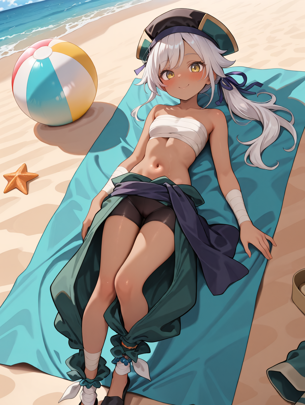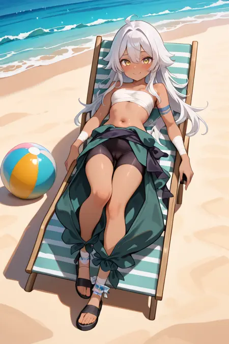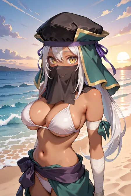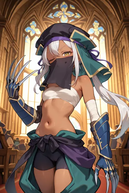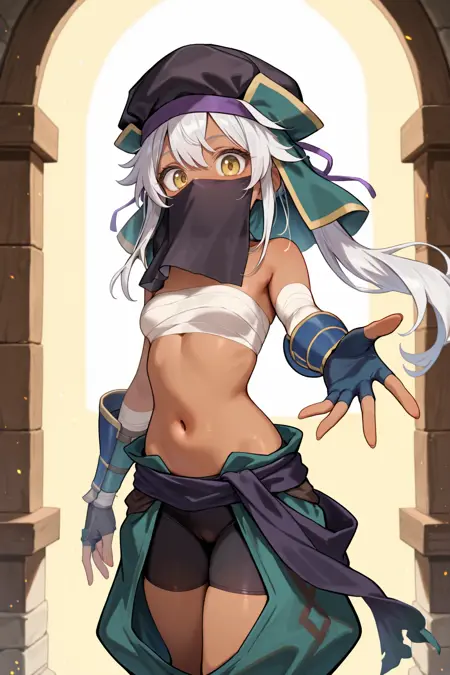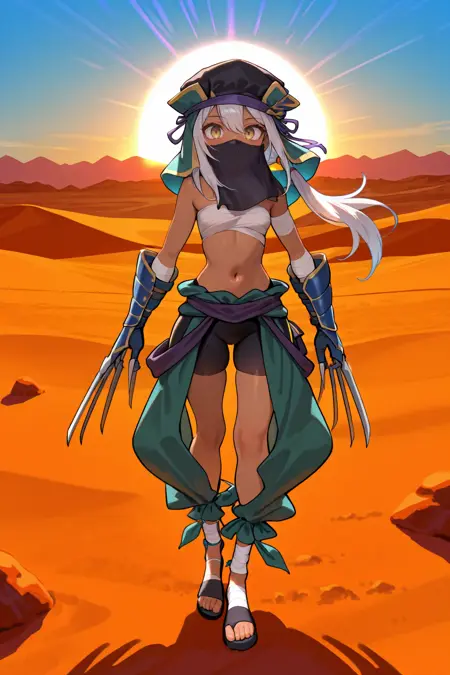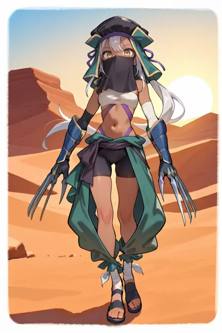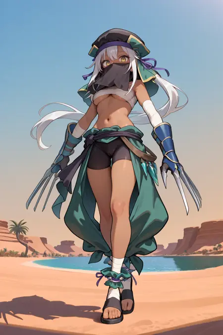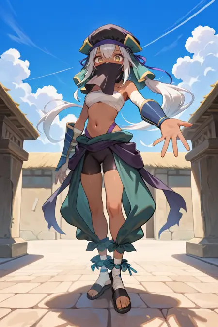 役立つタグ: 1girl、暗い肌、黄色い目、長い髪、白い髪、サイドポニーテール、帽子、リボン、口ヴェール、口が覆われている、サラシ、包帯で巻かれた胸、お腹、帯、包帯で巻かれた腕、青い腕当て、爪(武器)、自転車用ショート、取り外し可能なパンツ、包帯で巻かれた足首、足首巻き、黒いサンダル、