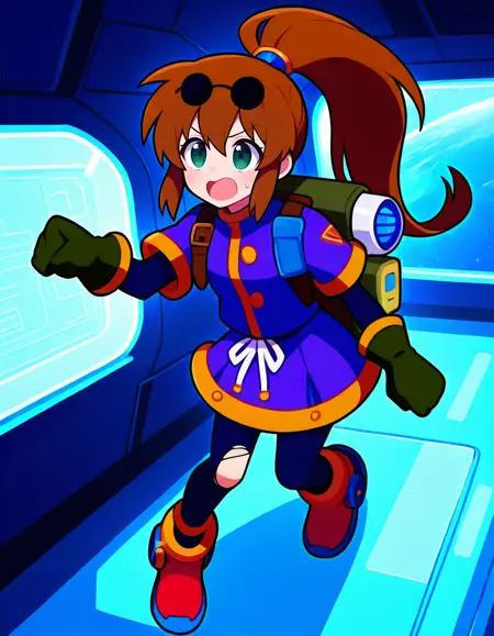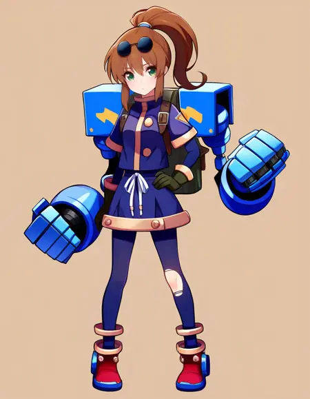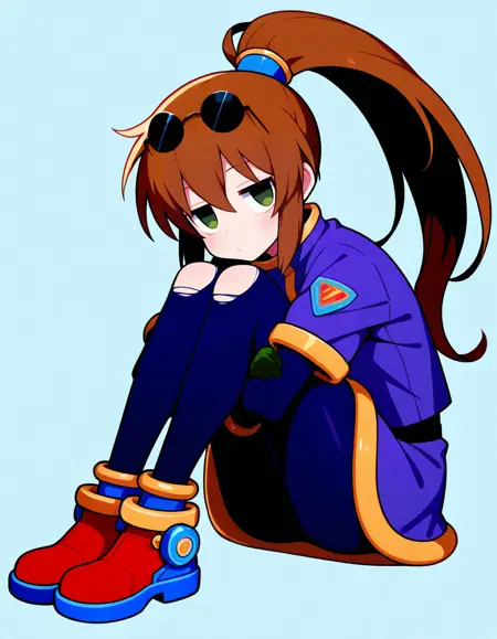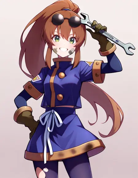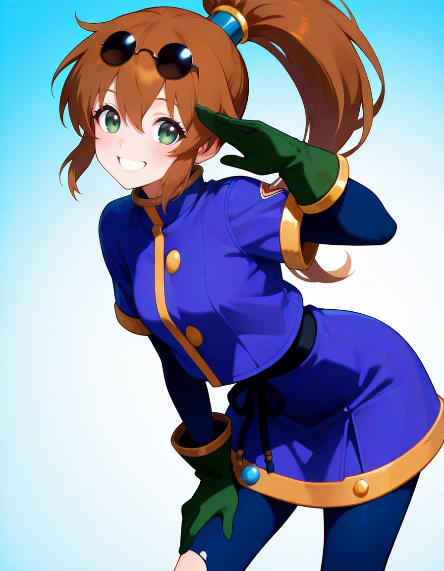 推奨されるプロンプト: 1girl, brown hair, ponytail, blue dress, skirt, pantyhose, green eyes, gloves, eyewear on head, torn pantyhose, footwear,