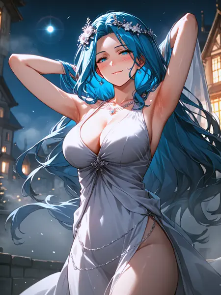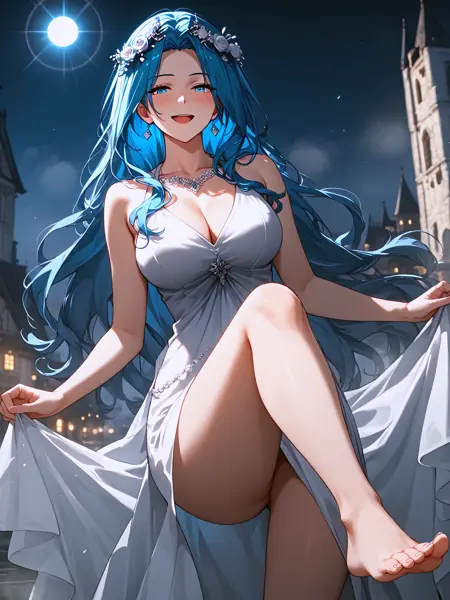 Blue hair, blue eyes, very long hair, cleavage, light skin,