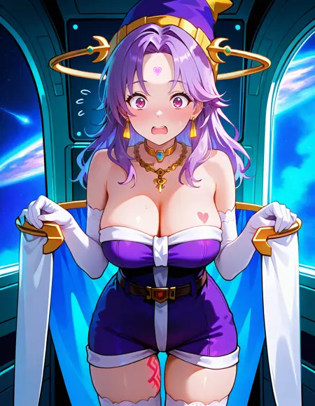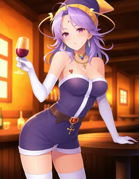 권장 프롬프트: 뾰족한 모자, 보라색 머리카락, 보라색 눈, 이마 마크, 어깨 노출, 팔꿈치 장갑, 귀걸이, 보석, 허벅지까지 오는 양말, 하이힐,