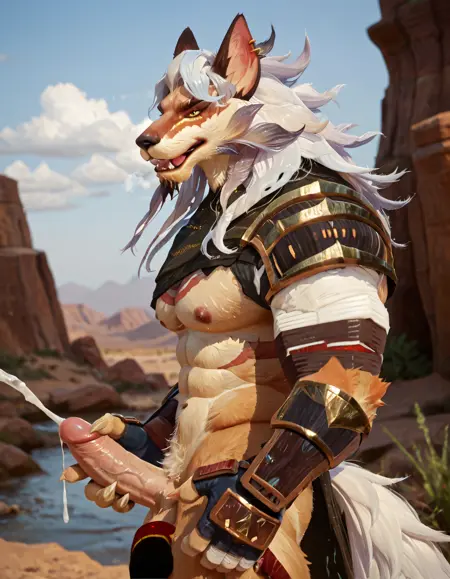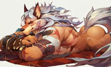 male focus, furry, furry male, bara, beard, claws, wolf, wolf tail, long hair, white hair, scar, earrings, tattoo, chest tattoo, detailed eyes, yellow eyes