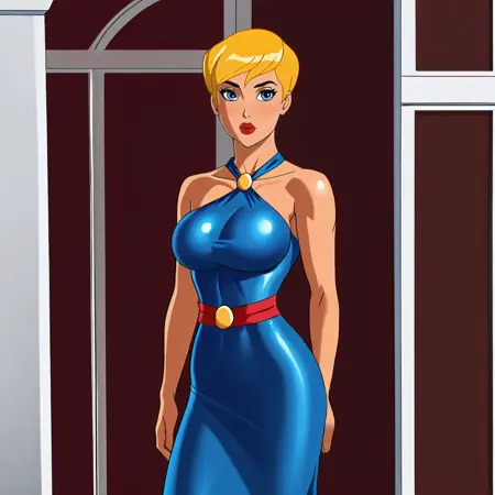 触发词:PowerGirlPublicEnemies, 1girl, 胸部露肤,金发,大乳房,短发,服装露肤,披风,蓝眼睛,蓝色手套,白色紧身衣,超级英雄,口红,妆容,嘴唇,腰带,深色皮肤