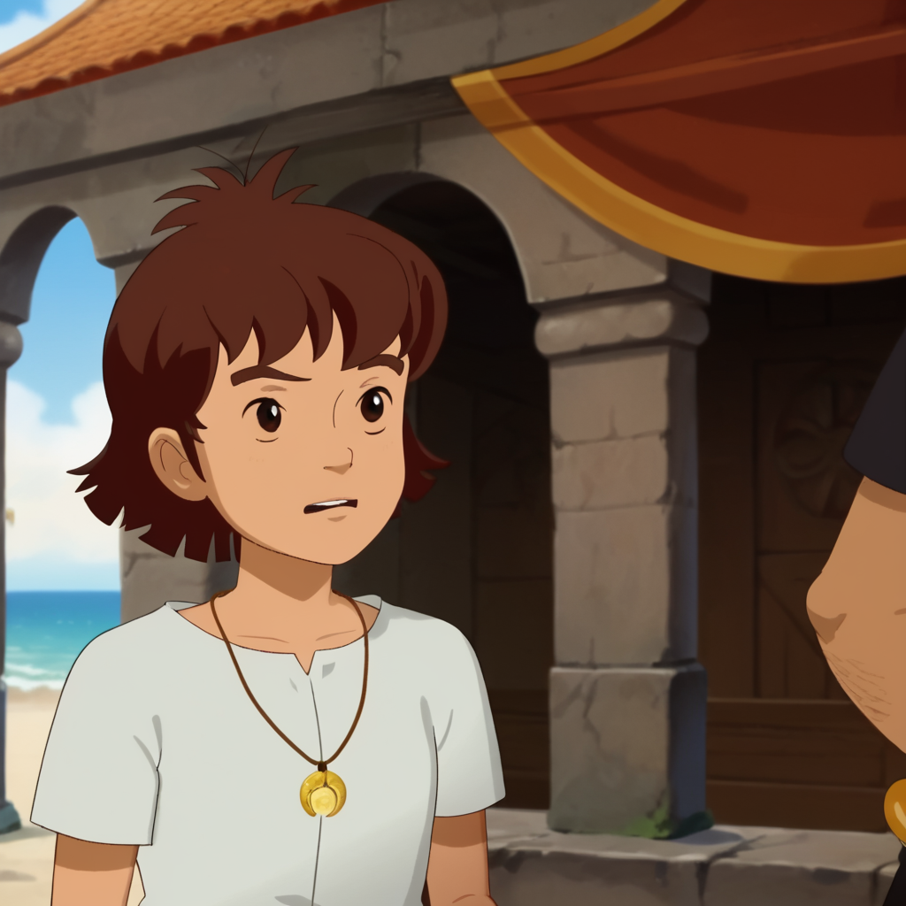 brown hair, esteban, short hair, brown eyes, white shirt, necklace, short sleeves, sandals, pants, solo, 1boy