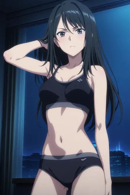 shutaura sequenzia, long hair, grey hair, swept bangs, grey eyes, black sports bra, black panties