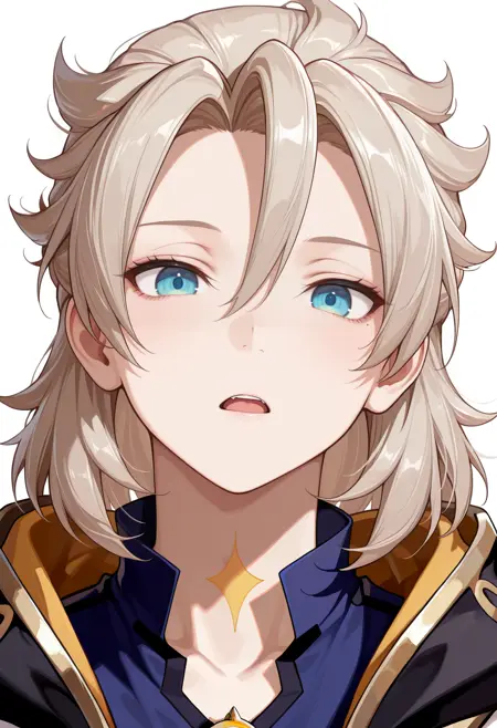 albedo, 1boy, male focus, solo, blue shirt, hair between eyes, closed mouth, hood, hood down, looking at viewer, bangs, shirt, portrait, upper body, green eyes,