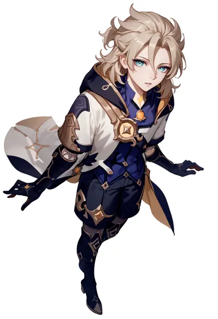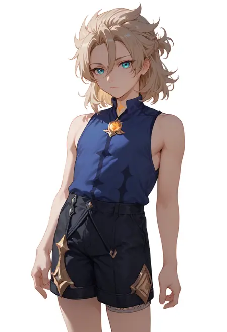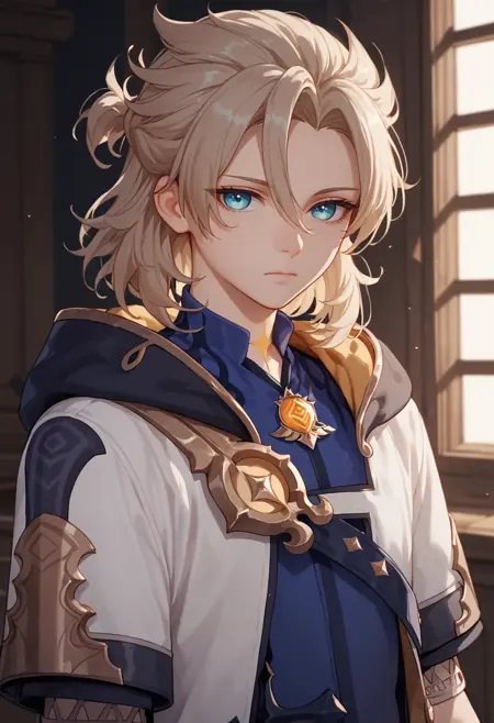 albedo, 1boy, male focus, solo, blue shirt, hair between eyes, closed mouth, hood, hood down, looking at viewer, bangs, shirt, portrait, upper body, green eyes,