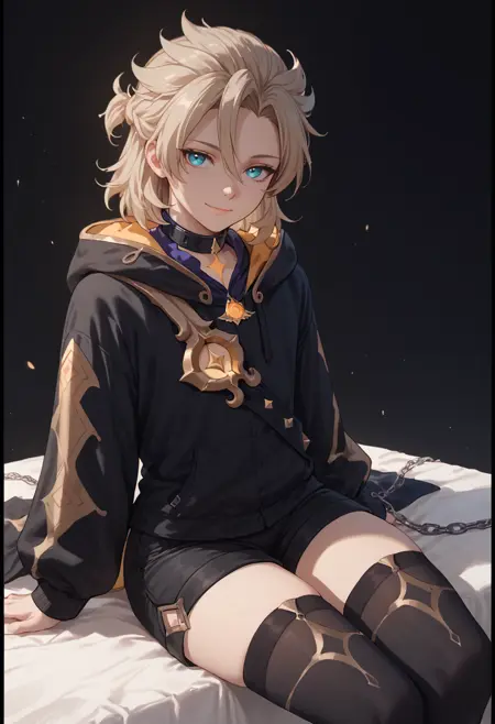albedo, 1boy, male focus, chain, solo, black border, thighhighs, hood, looking at viewer, hood down, sitting, shorts, bangs, black thighhighs, collar, black shorts, hoodie, smile, long sleeves, closed mouth, alternate costume
