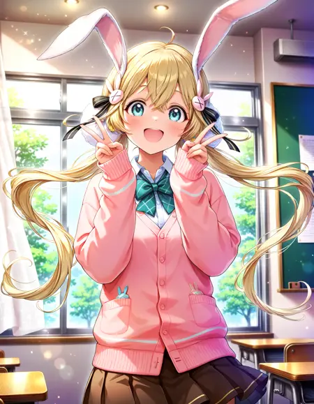 tsukimi yozora, blonde hair, long hair, ahoge, twintails, hair between eyes, rabbit hair ornament, hair ornament, hair ribbon, rabbit ears, blue eyes