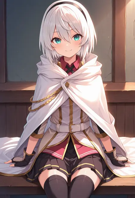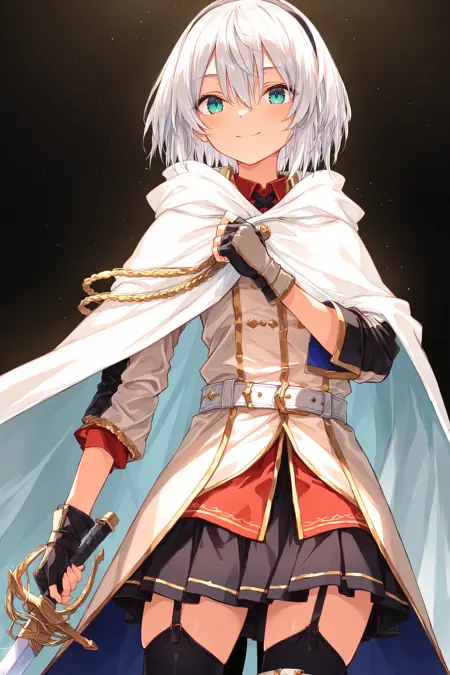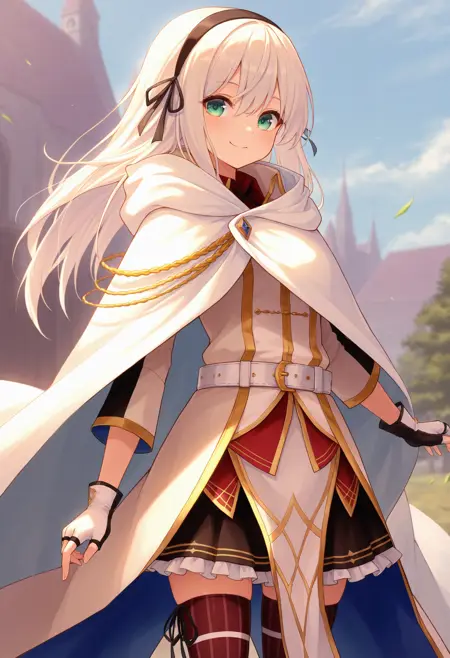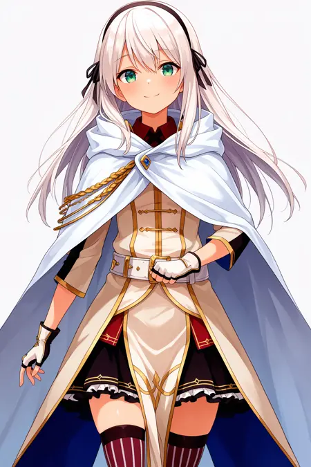 阿维莉亚服装:白色斗篷, 白色披风, 腰带, 露指手套, 衬衫, 白色手套, 裙子, 披风, 长袖, 连帽, 黑色短裙, 荷叶边裙, 条纹过膝袜, 骨盆帘