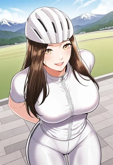 4. ((白いサイクリングトップ、白いサイクリングショート)) + オレンジレンズのサイクリングサングラス、白いサイクリングヘルメット、白い靴下、白いサイクリングシューズ