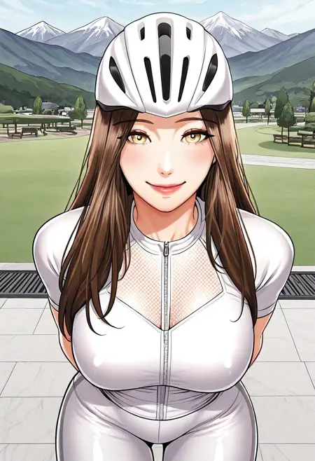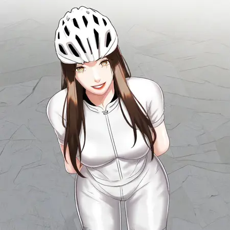 14. ((섹시한 짧은 소매 흰 자전거 상의, 투명한 피시넷 부분, 흰 자전거 바지, ))