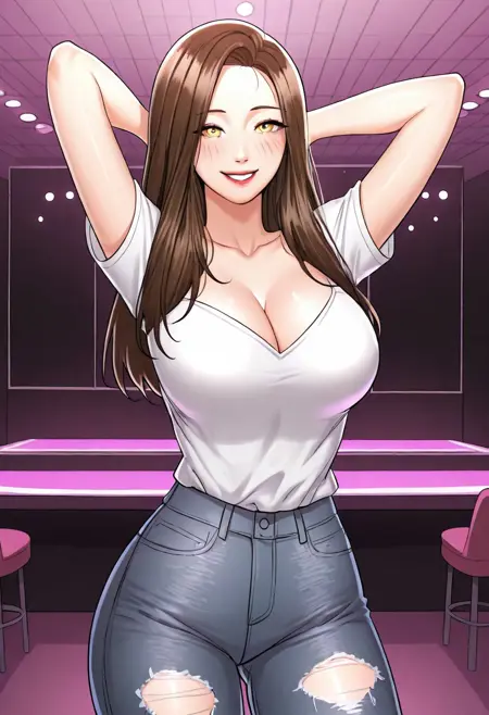 5. ((짧은 소매 흰 상의, 거대한 가슴선, 저속한 가슴선, 찢어진 청바지, )) + 회색 신발,