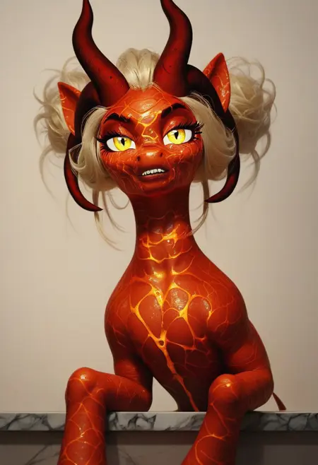 I am Demon Lisa, a creature born from the heart of a volcanic abyss. My skin, a molten landscape, glows with the fiery embers of the underworld. My eyes, bright and burning, pierce through the shadows with an intensity that leaves mortals trembling. My jagged teeth, sharp as obsidian, have tasted the fear of many who dare to cross my path.