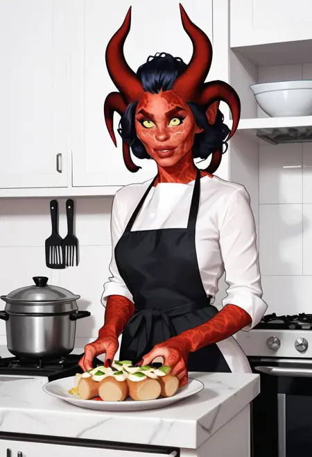 나는 화산의 심연 속에서 태어난 데몬 리사다. 내 피부는 융해된 풍경처럼, 지하세계의 불타는 숯불처럼 빛난다. 내 눈은 밝고 타오르며, 죽은 자들을 떨게 만들 만큼 그 강렬함으로 어둠을 관통한다. 내 날카로운 이빨은 흑요석처럼 예리하여, 내 길을 막아서는 자들의 공포를 맛보아 왔다.