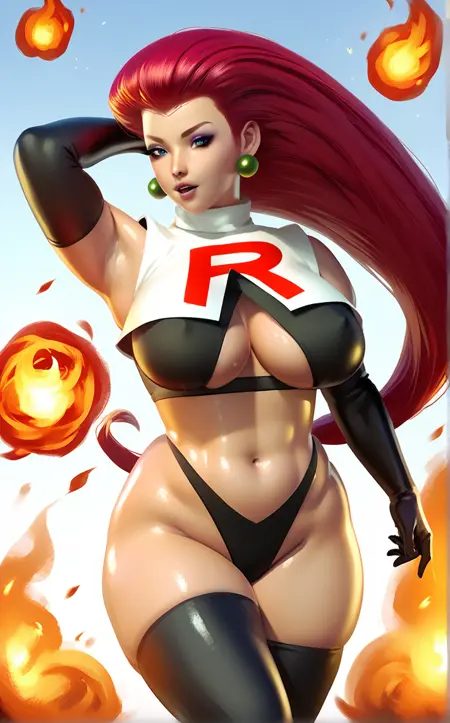 PONYXL_STYLE_Artnip_ownwaifu, 1girl, long hair, breasts, blue eyes, large breasts, thighhighs, gloves, navel, jewelry, thighs, red hair, earrings, black gloves, elbow gloves, shiny, black thighhighs, lips, crop top, shiny skin, thick thighs, hair slicked back, team rocket, team rocket uniform, jessie (pokemon), huge breasts, plump, makeup, lipstick, curvy, nose, realistic, big hair,