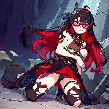 1girl, solo, SeeleVelionaNyx, red eyes, black and red hair, two-tone hair, multicolored hair, colored inner hair, long hair, hair between eyes, ahoge