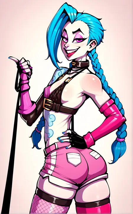 PONYXL_STYLE_darkminou_ownwaifu, 1girl, blue hair, small breasts, smile, fishnet thighhighs, fingerless gloves, bare shoulders, weapon, ass, braid, short shorts, pink eyes, nail polish, grin, twin braids, sketch, makeup, single thighhigh, fishnets, jinx (league of legends), looking at viewer, teeth, tongue, tattoo, asymmetrical legwear, viewer holding leash, pink thighhighs, pink shorts, collar, pov, naughty face, asymmetrical gloves, mismatched gloves