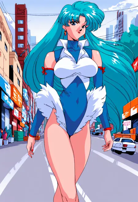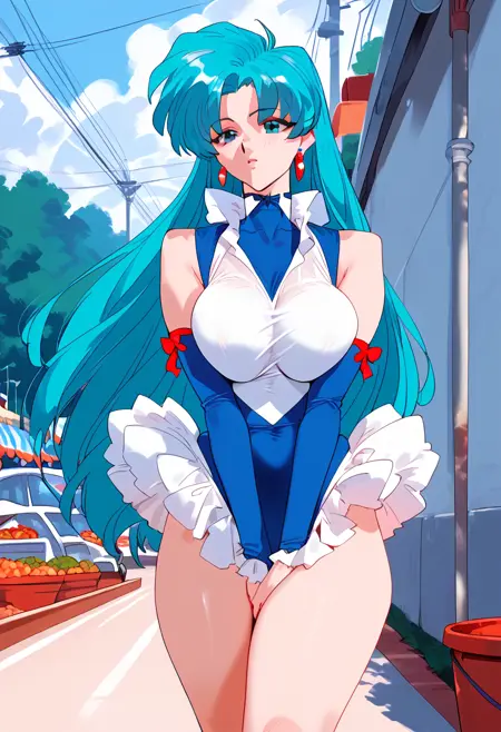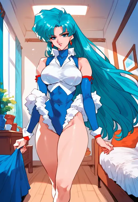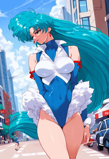 트리거: milfyviper, 긴 머리, 큰 가슴, 청록색 머리 여자, 귀걸이, 분리형 소매, 레오타드