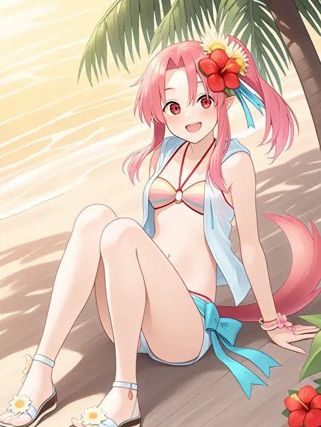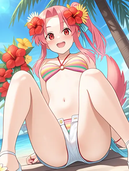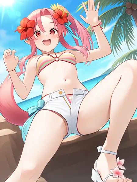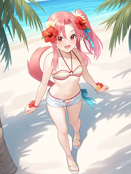 프롬프트 예시: ,natu,pink hair,side ponytail,striped bikini,white short shorts,open button,hair flower,tail,sandals,blue ribbon
