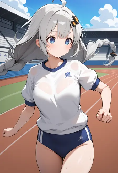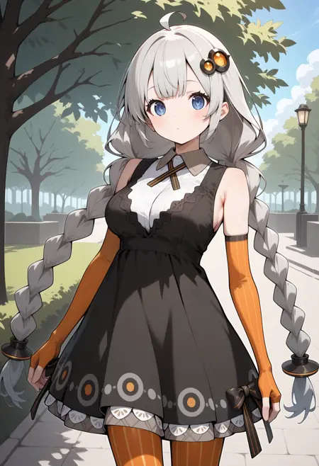 outfit2aaakari, long hair, grey hair, twin braids, ahoge, hair ornament, blue eyes, breasts, white shirt, black dress, sleeveless, elbow gloves, fingerless gloves, orange gloves, striped pantyhose, orange pantyhose