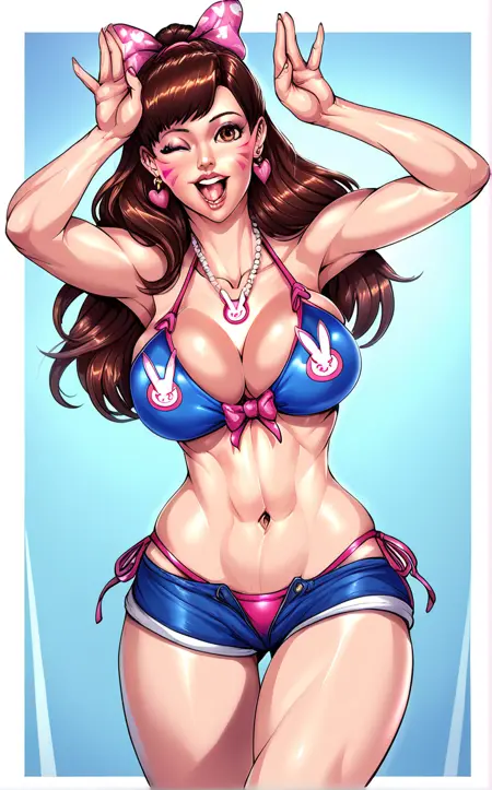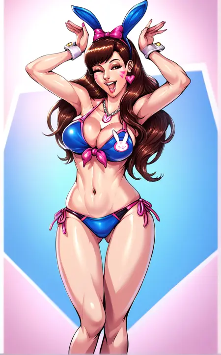 ScreamExpression_Faymantra_ownwaifu, 1girl, long hair, large breasts, smile, brown hair, hair bow, navel, cleavage, brown eyes, jewelry, swimsuit, full body, heart, side-tie bikini bottom, one eye closed, shorts, necklace, high heels, facial mark, sandals, toenails, toenail polish, whisker markings, d.va (overwatch), looking at viewer, open mouth, nail polish, arms up, toes, thigh gap, front-tie top, facepaint, standing, collarbone, teeth, hands up, groin, head tilt, ass visible through thighs, pink bow, ;d, pink nails, blue bikini, rabbit pose, adapted costume, flag print, toeless footwear, screaming