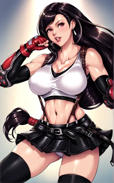 Main_STYLE_Faymantra_ownwaifu, 1girl, fighting stance, large breasts, black skirt, black hair, red eyes, black thighhighs, elbow gloves, navel, cleavage, jewelry, underwear, white panties, earrings, midriff, miniskirt, fingerless gloves, crop top, pantyshot, suspenders, tank top, suspender skirt, elbow pads, tifa lockhart, thighs, parted lips, taut shirt, collarbone, pleated skirt, taut clothes, arm guards