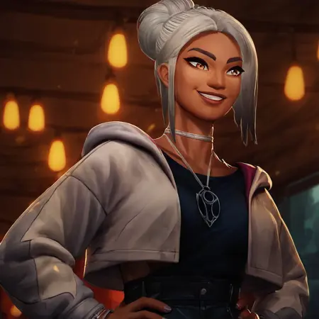 Character tags: jettval, 1girl, single hair bun, hair bun, blue eyes, grey hair, dark-skinned female