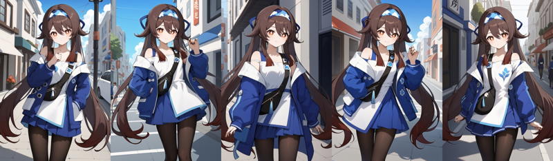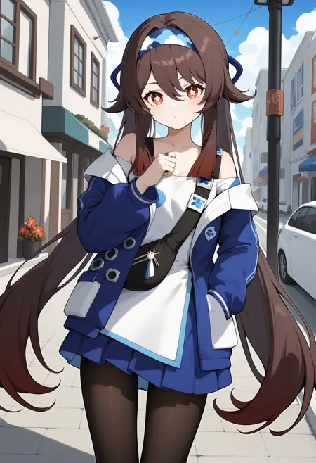 outfit3aahutao, long hair, brown hair, twintails, hairband, red eyes, flower-shaped pupils, small breasts, white dress, fanny pack, off shoulder, blue jacket, open jacket, long sleeves, blue skirt, black pantyhose