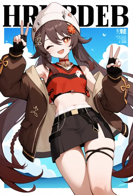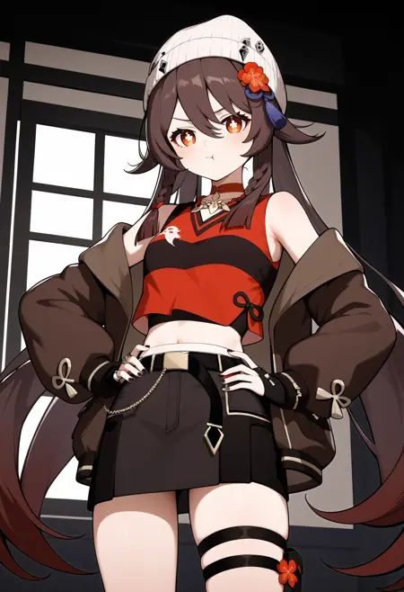 outfit4aahutao, long hair, brown hair, red eyes, black skirt, long sleeves, hair ornament, midriff, beanie, red shirt, belt, twintails, small breasts, fingerless gloves, flower-shaped pupils, thigh strap, braid, brown jacket, black gloves, white headwear, sleeveless, red choker, necklace