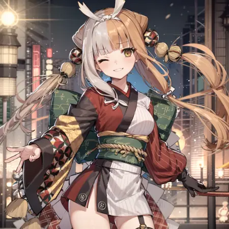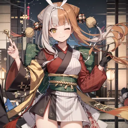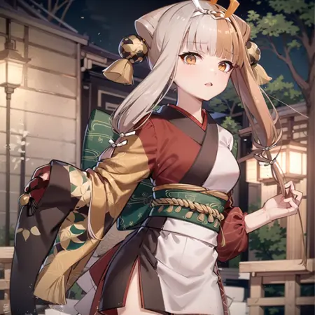 a very stylized asian girl dressed as a geisha standing in an outdoor area, split-color hair, 1girl, solo, multicolored hair, japanese clothes, two-tone hair, brown hair, long hair, Izumo,
