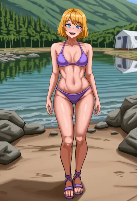 有名な『フライデー13日』NESゲームに登場するカウンセラー/プレイ可能なキャラクター、クリッシー。プロンプトは「crissyf13,blonde hair」で、衣装は「パープルのショートパンツ、パープルのシャツ、スニーカー、白い靴下」。有名なバージョン。