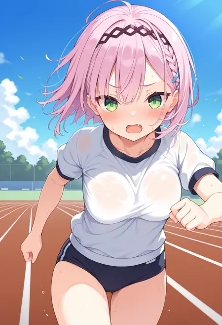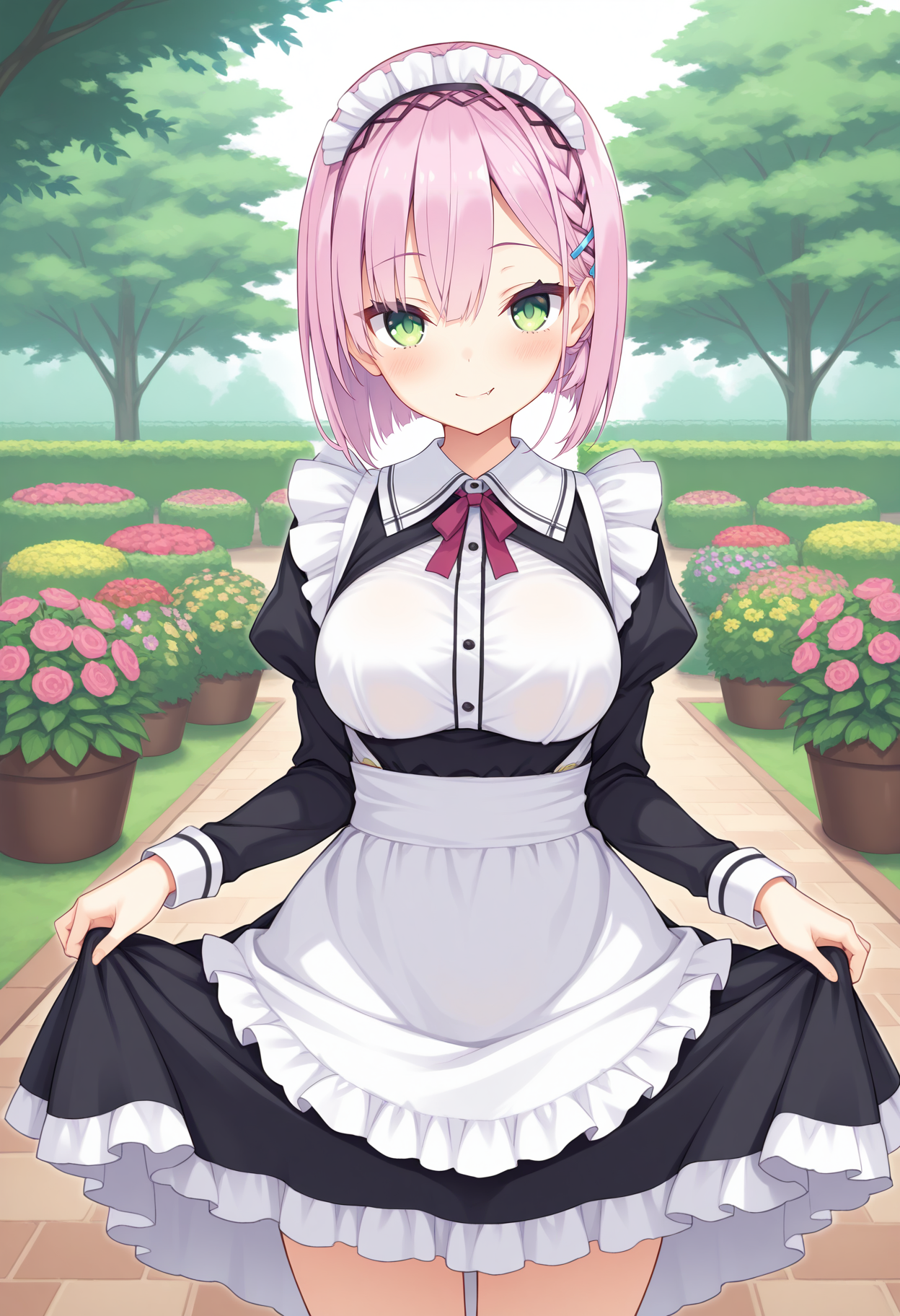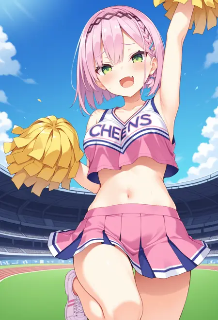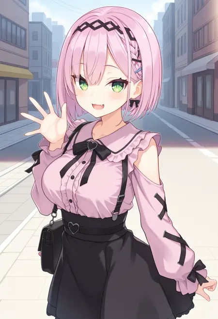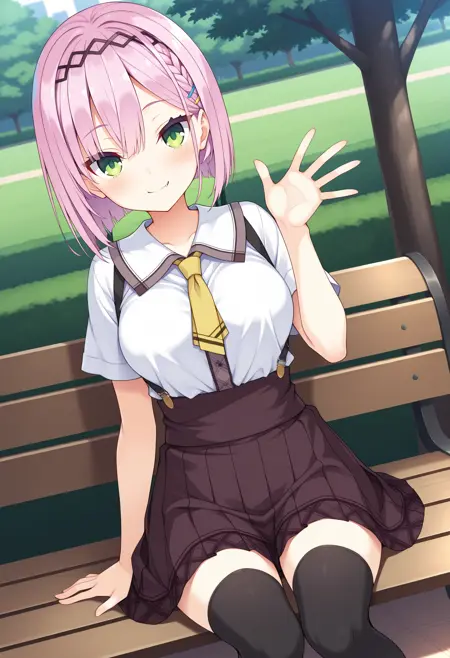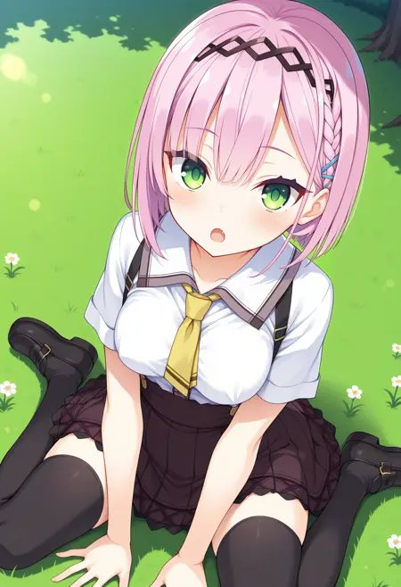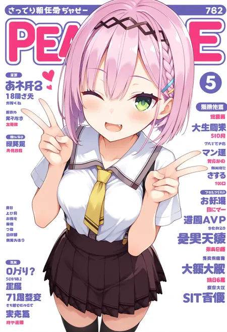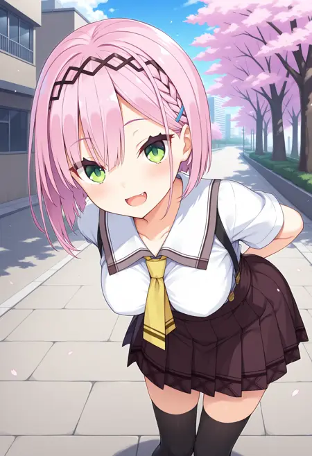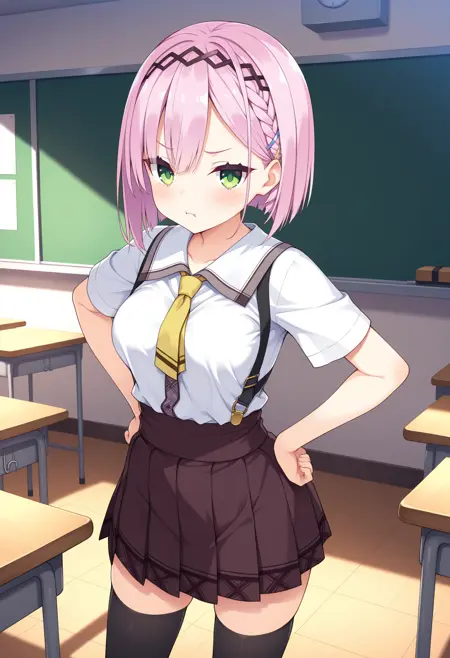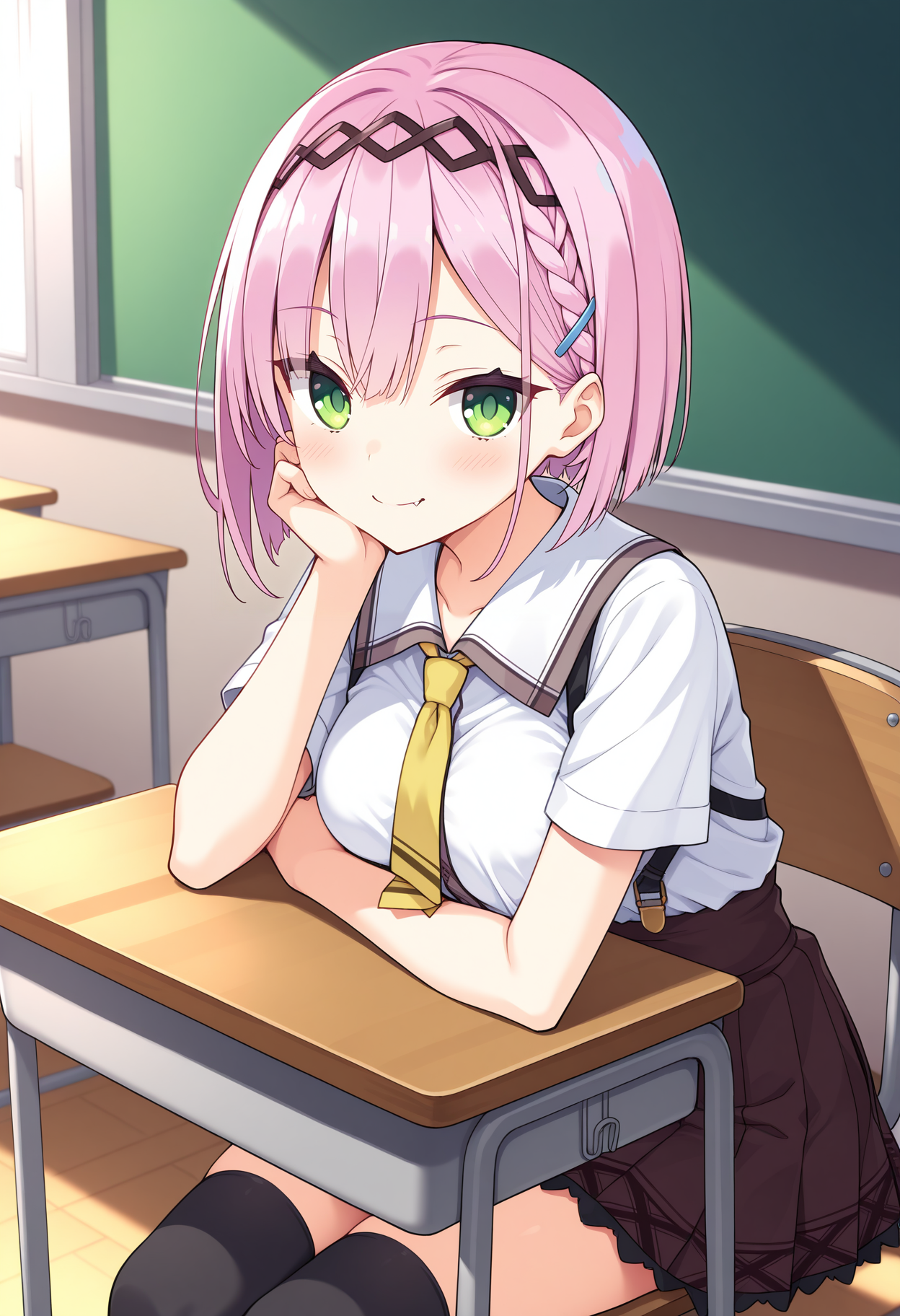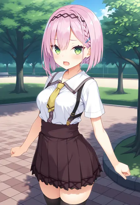 outfit1aaamane, pink hair, short hair, braid, hairband, hair ornament, hairclip, green eyes, fang, breasts, school uniform, yellow necktie, white shirt, short sleeves, suspender skirt, brown skirt, black thighhighs