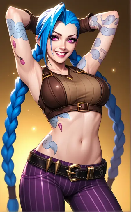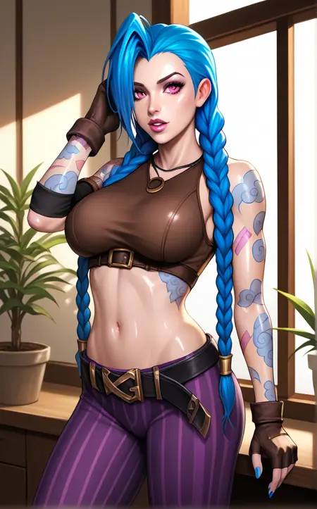 PONYXL_STYLE_mosqhentai_ownwaifu, 1girl, realistic, jinx (league of legends), striped pants, braid, gloves, fingerless gloves, very long hair, twin braids, striped clothes, bare shoulders, pants, tattoo, navel, arm tattoo, crop top, nail polish, belt, purple pants, blue hair, asymmetrical bangs, shoulder tattoo, hair over one eye, stomach tattoo, large breasts, brown gloves, midriff, black belt, stomach, black gloves, brown shirt, pink eyes, striped sleeves, twintails,