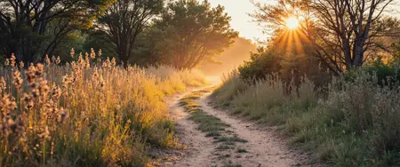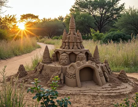 - バッシュベルドの美的感覚を基調とした、黄金色の草原、土の道、象徴的なアフリカの植物を備えた圧倒的な風景を描画します。