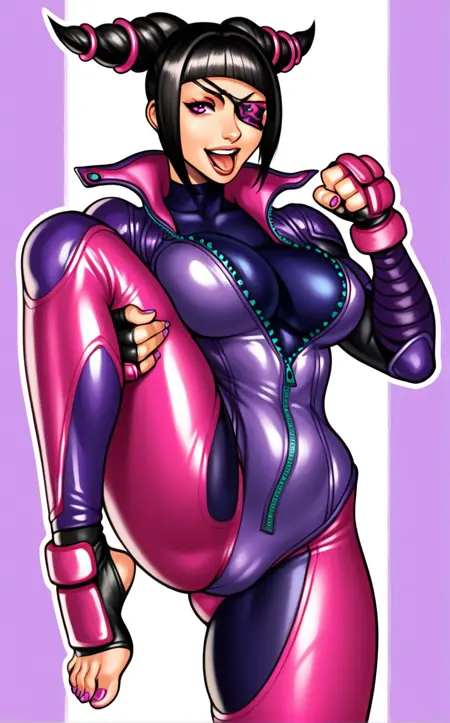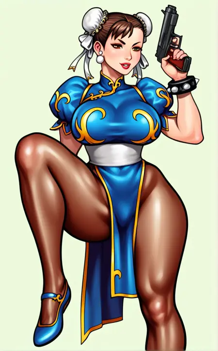 PONYXL_STYLE_Loubotix_ownwaifu, a close up of a woman in a blue and white outfit holding a gun, 1girl, blue dress, spiked bracelet, large breasts, brown eyes, brown hair, brown legwear, bun cover, china dress, chinese clothes, double bun, earrings, jewelry, pantyhose, pelvic curtain, puffy sleeves, sash, spikes, chun-li, hair bun, kicking, makeup, female, chinese clothing, clothed, capcom, chinese dress, anthro, tights, mammal, hi res, street fighter, simple background, asian clothing, human focus, not furry focus