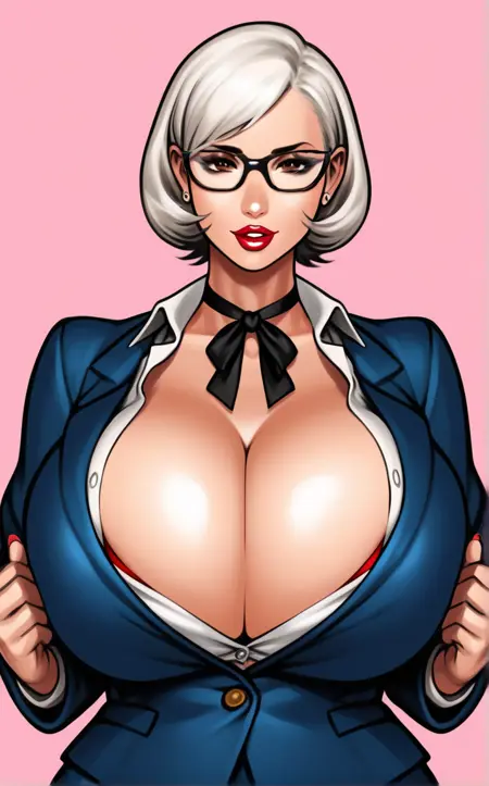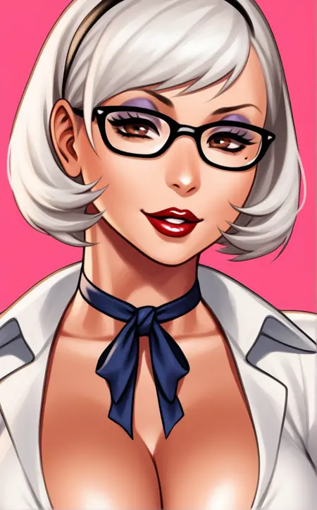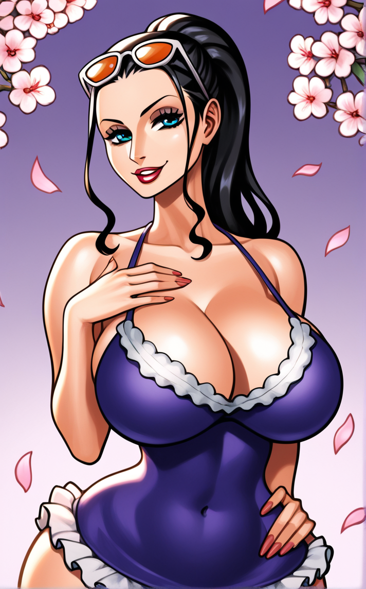 PONYXL_STYLE_Loubotix_ownwaifu, a cartoon of a woman in a purple dress and goggles, 1girl, black hair, blue eyes, large breasts, cherry blossoms, cleavage, confetti, eyewear on head, falling petals, hand on hip, long hair, petals on liquid, rose petals, sunglasses, nico robin, looking at viewer, bare shoulders, collarbone, ponytail, parted lips, covered navel, sidelocks, bag, hand on own hip, makeup, hand on own chest, lipstick, skin tight, purple background, tight clothes, narrow waist, eyelashes, spaghetti strap, tight dress, big breasts, female, clothing, clothed, anthro, mammal, hi res, one piece, simple background