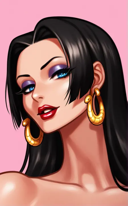 PONYXL_STYLE_Loubotix_ownwaifu, a cartoon picture of a woman in a red dress with a dragon, 1girl, black hair, blue eyes, large breasts, cleavage, earrings, epaulettes, jewelry, boa hancock, long hair, navel, midriff, snake, smile, long sleeves, collarbone, stomach, cape, crop top, covered nipples, looking to the side, lips, makeup, big breasts, female, ear piercing, human focus, feral, scalie, clothing, clothed, reptile, mammal, hi res, one piece, duo, not furry focus
