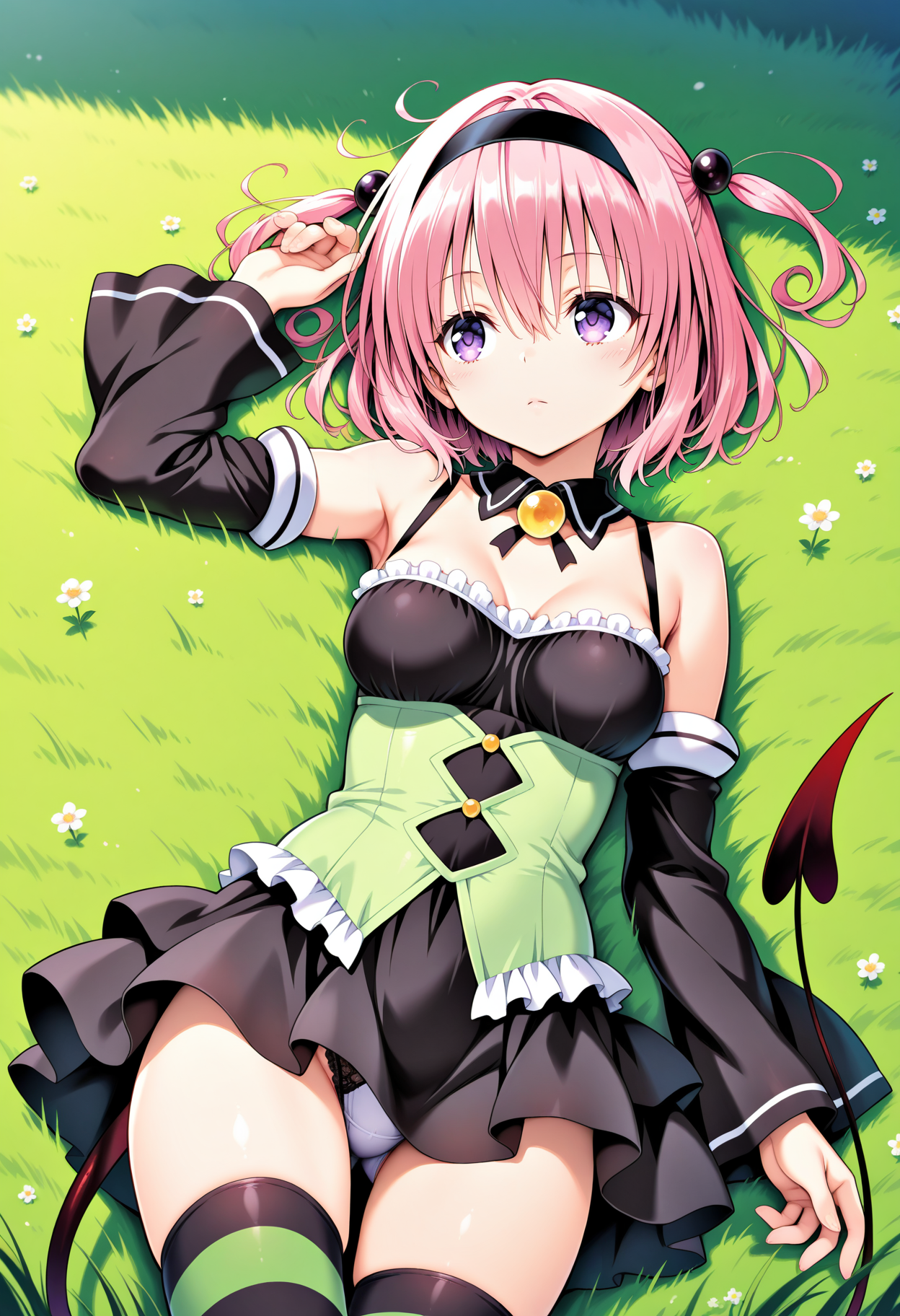 outfit3aamomo, short hair, pink hair, two side up, black hairband, purple eyes, medium breasts, demon tail, detached collar, bare shoulders, frills, black dress, green shirt, detached sleeves, striped thighhighs
