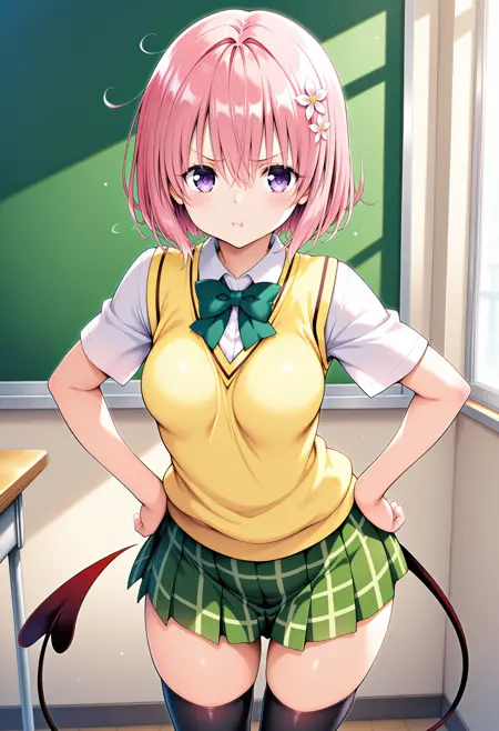 outfit1aamomo, short hair, pink hair, hair flower, purple eyes, medium breasts, demon tail, school uniform, green bowtie, white shirt, sweater vest, yellow vest, short sleeves, plaid skirt, green skirt, black thighhighs