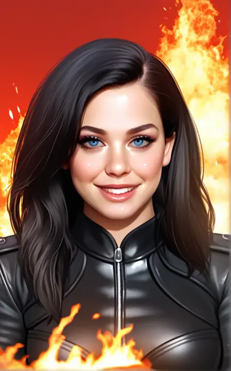 PONYXL_STYLE_Negisary_ownwaifu, there is a woman with a black leather jacket and a red background, 1girl, autumn, blue eyes, burning, explosion, fire, flame, parted lips, solo focus, tree, long hair, looking at viewer, black hair, portrait, realistic, nose, smile, multiple girls, upper body, photorealistic